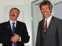 Daraufhin erfolgte die Weitergabe der Präsidentschaft an Michael Beck, der seinerseits dem scheidenden Präsidenten für seine geleistete Arbeit mit einem kleinen Präsent dankte und sichtlich aufgeregt, ob er den neuen Würden und Aufgaben gewachsen ist, sein kommendes Lionsjahr vorstellte. Sogleich durfte er auch die ersten Ehrungen vornehmen. Eine ganz besondere Ehrung verdiente die 45-jährige Mitgliedschaft des Lions-Freundes Hermann Weiss, der die Ehrennadel sichtlich gerührt entgegennahm. Natürlich wurde auch Frau Weiss mit einer Orchidee zu diesem Jubiläum gedankt und gratuliert. Auch der scheidende Präsident Volkmar Schöllhorn bekam für seine 10-jährige Mitgliedschaft eine Ehrennadel.